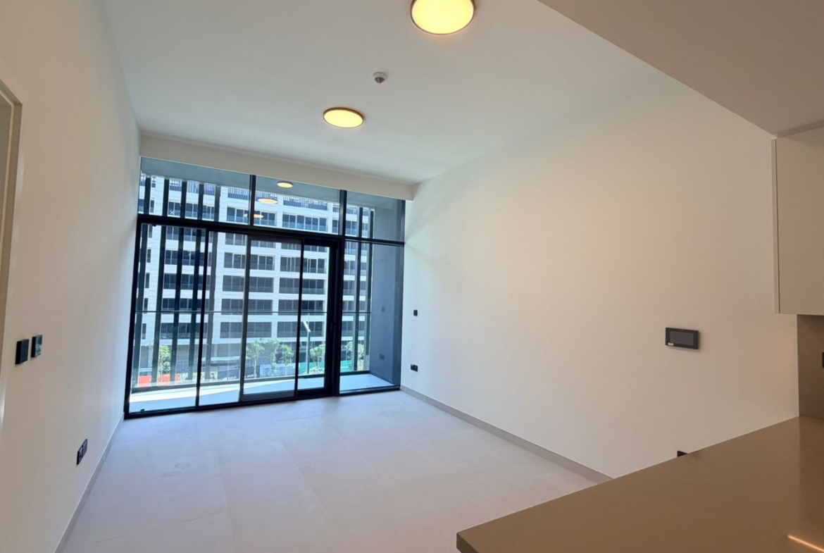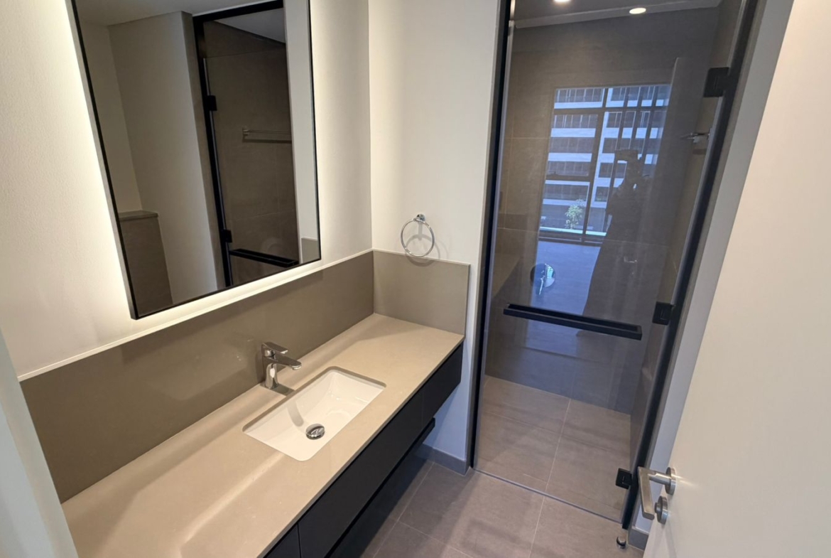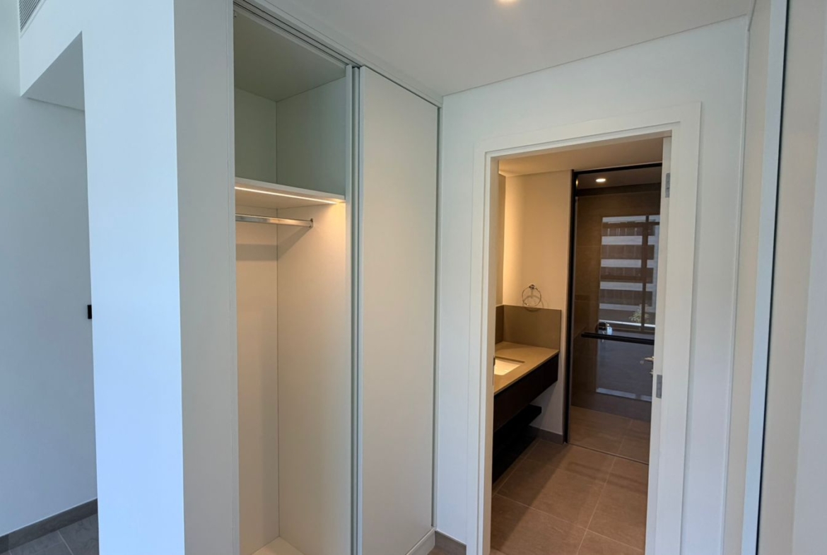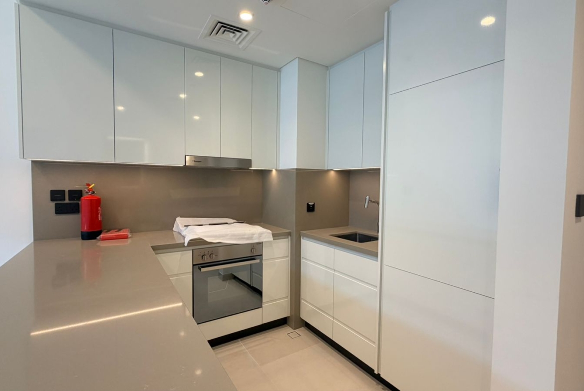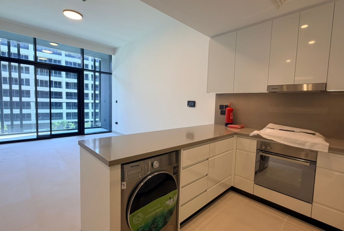 The apartment features a well-planned layout with an open-plan living and dining area, allowing for maximum natural light and a seamless flow of space. The bedroom is generously sized with built-in wardrobes, while the kitchen is fitted with high-quality finishes and modern cabinetry. Large windows enhance the overall ambiance, creating a bright and welcoming environment.